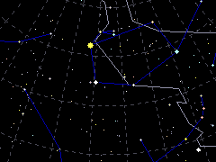 - 冬、天頂付近にある黄色の明るい星が、ぎょしゃ座の1等星のカペラ。カペラのまわりの、五角形の星の並び。
