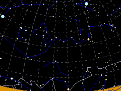 - しし座の明るい星(レグルス)の南南西に見える赤い星が、うみへび座のアルファド。アルファルドからふたご座の1等星ポルックスの方に、6つの3〜4等星でできた楕円形が、うみへびの頭。ここから東に向かってへびの胴体が伸びる。ろくぶんぎ座、コップ座、からす座が背中に乗っている。90°以上に広がる細長い星座。